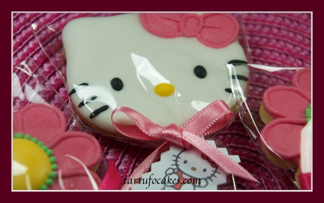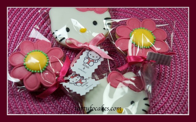 Este domingo ha cumplido 4 años Noa, nuestra vecinita preferida. A Noa le encantan las galletas, así que le hemos hecho unas de Hello Kitty, un clásico ya, pero infalible. Las hemos combinado con unas flores a juego.