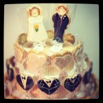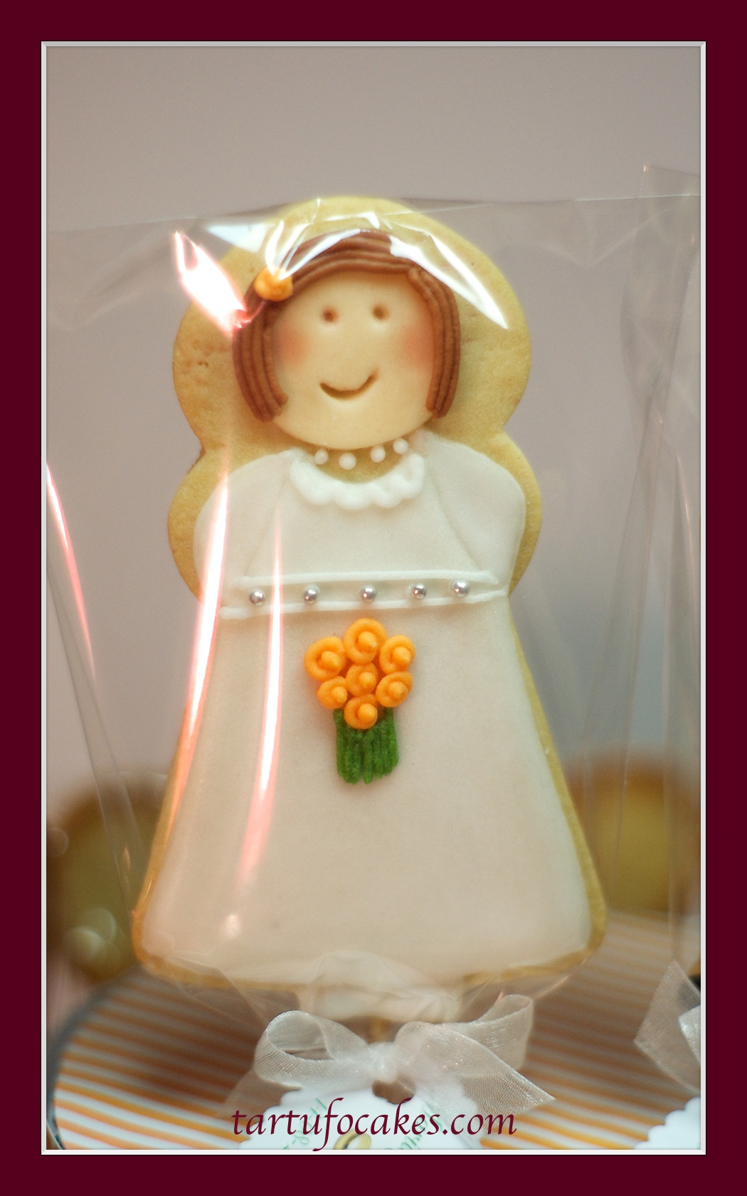 Nos parecía buena idea incluir algunas galletas nupciales, corazones de novia, novio y unos acolchados, y tras darle unas vueltas, se nos ocurrió esta forma de presentarlas, horneándolas con palito, y pinchadas en un dummy con forma de tarta nupcial con los novios arriba.